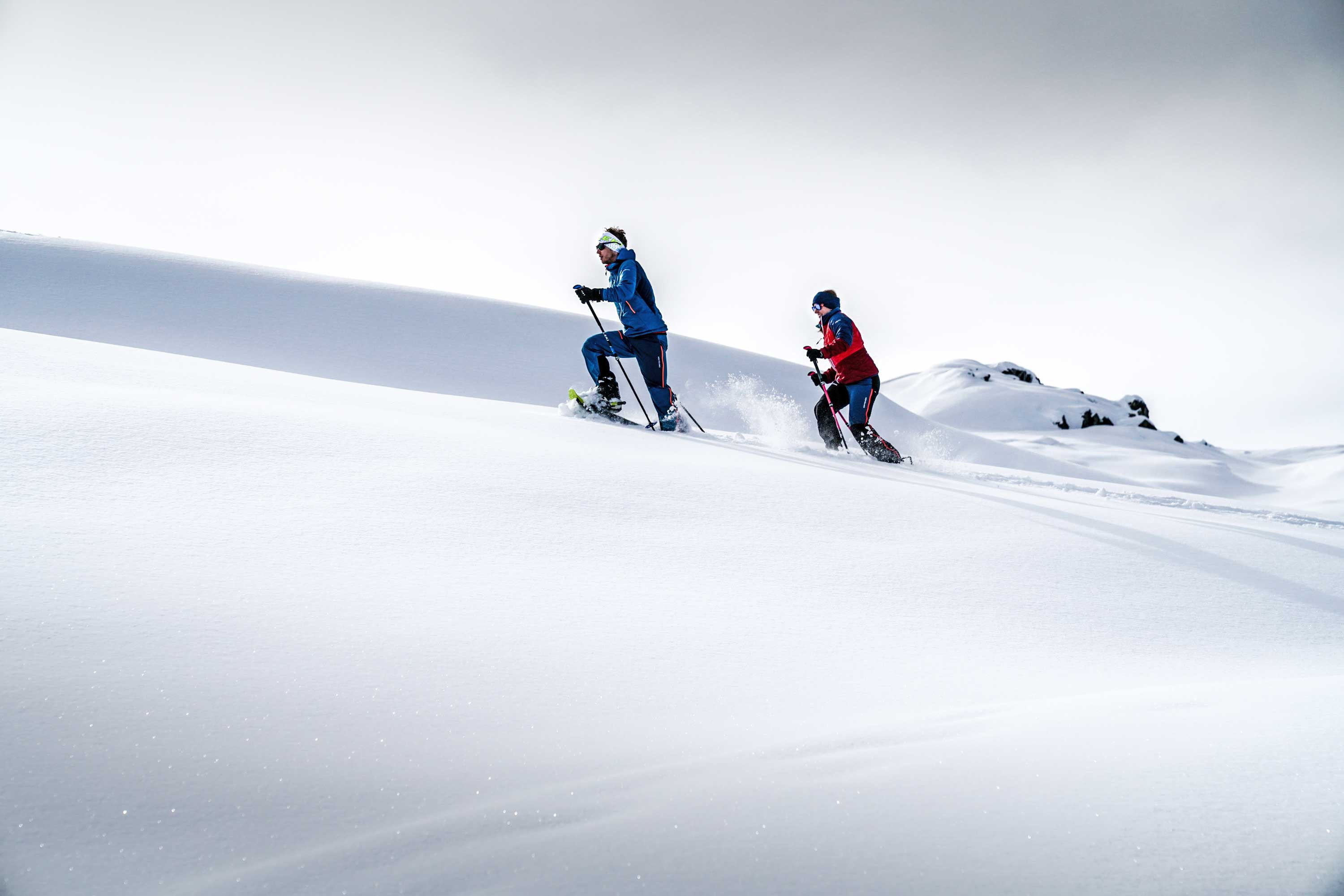 Mit am wichtigsten sind natürlich die Schneeschuhe. Sie schaffen durch die Erweiterung der Fläche an den Füßen eine bessere Verteilung des Körpergewichts, wodurch ein zu starkes Einsinken in den Tiefschnee verhindert wird. Auf diese Weise kannst du wunderbar und ohne große Anstrengung auf dem Schnee gleiten.
