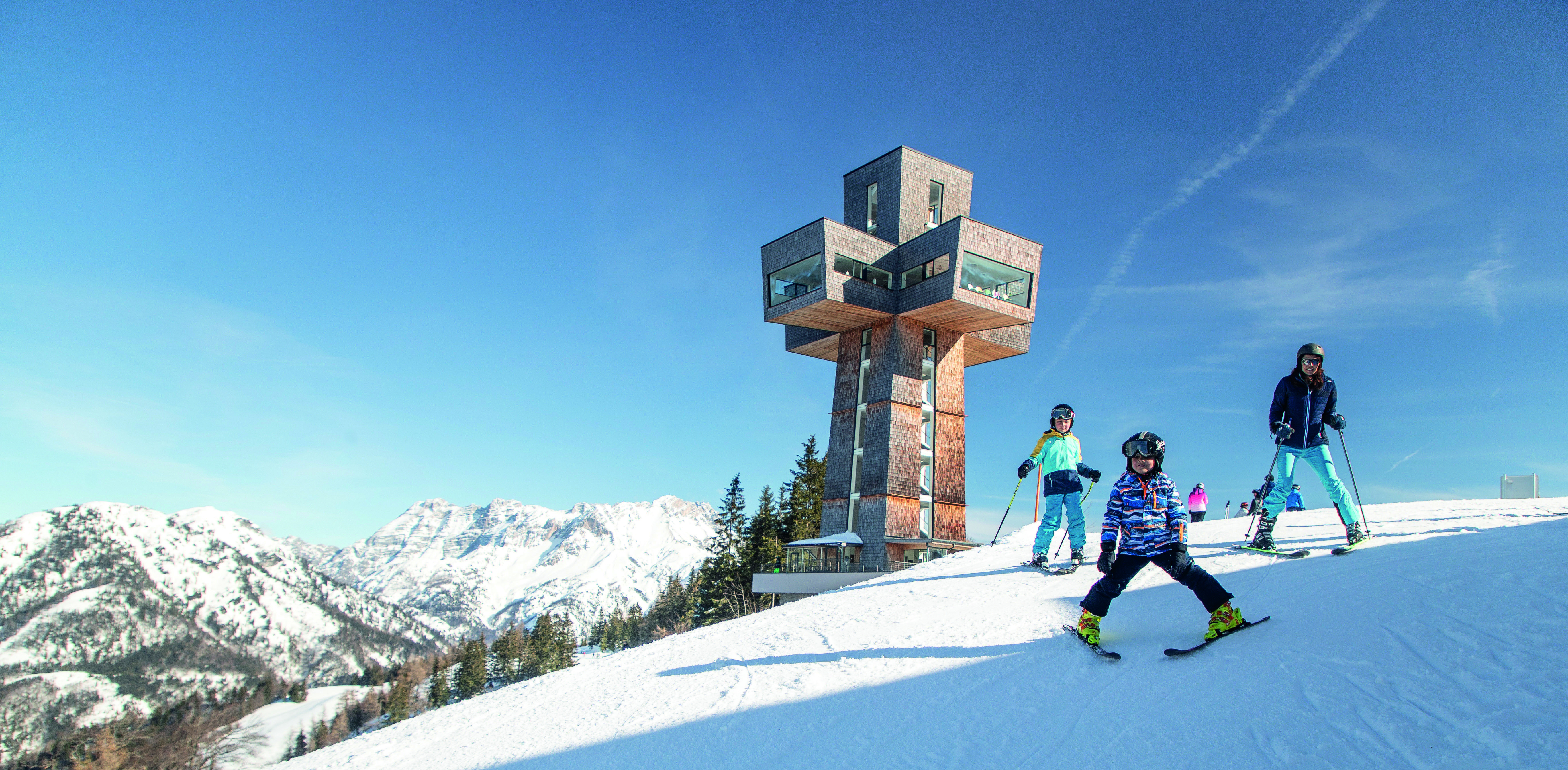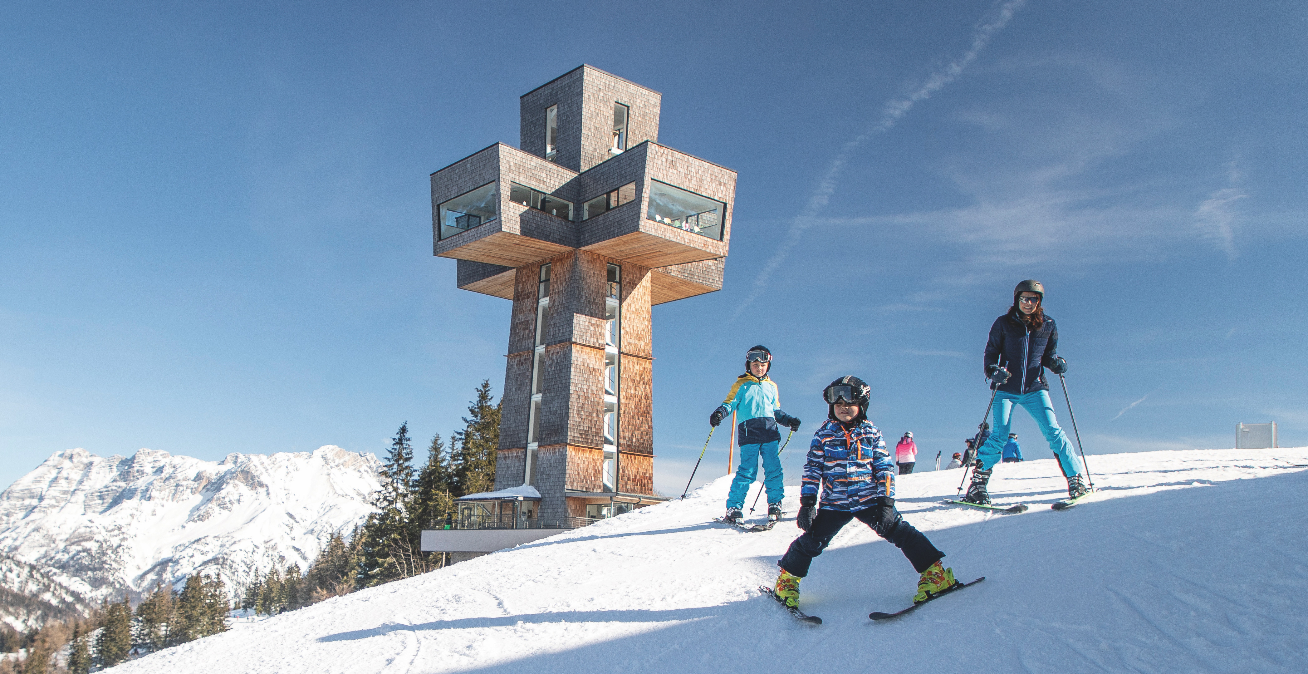 Etwas beschaulicher geht es auf der Steinplatte bei Waidring zu. Im Dreiländereck von Tirol, Salzburg und Bayern warten rund 40 Pistenkilometer darauf entdeckt zu werden. Breite, weitläufige Abfahrten laden hier zu ausgedehnten Carving-Schwüngen ein, während die Plateau-Lage des Höhenskigebiets sowohl Sonne als auch Schneesicherheit verspricht. Zu den Highlights des Skigebiets zählen außerdem der Snowpark sowie die Aussichtsplattform neben der Bergstation der 15-EUB Steinplatte.