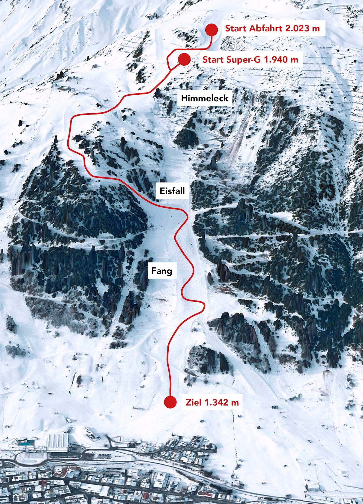 Die berühmte Kandahar-Rennpiste hat es in sich: Das durchschnittliche Gefälle von 34 Prozent sorgt für Geschwindigkeiten von bis zu 130 km/h. Der Start liegt unterhalb des Kapall auf 2.065 Metern. Von dort führt die Karl-Schranz-Kandahar-Strecke über das Himmeleck und den Eisfall hinab ins Zielstadion. Hobby-Skifahrer können sich einiges von den Profis abschauen und die anspruchsvolle Abfahrt nach den Wettkämpfen selbst testen.