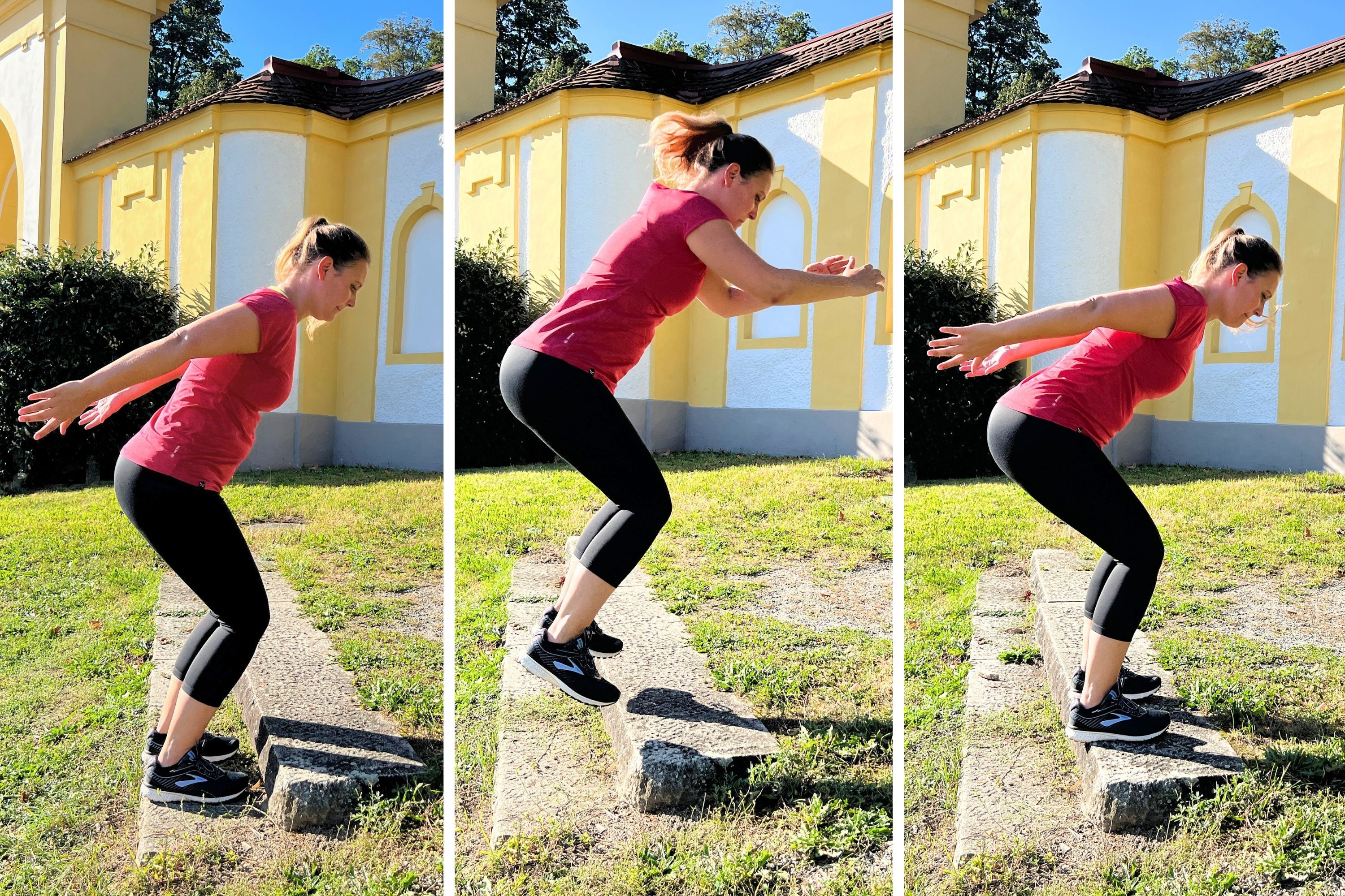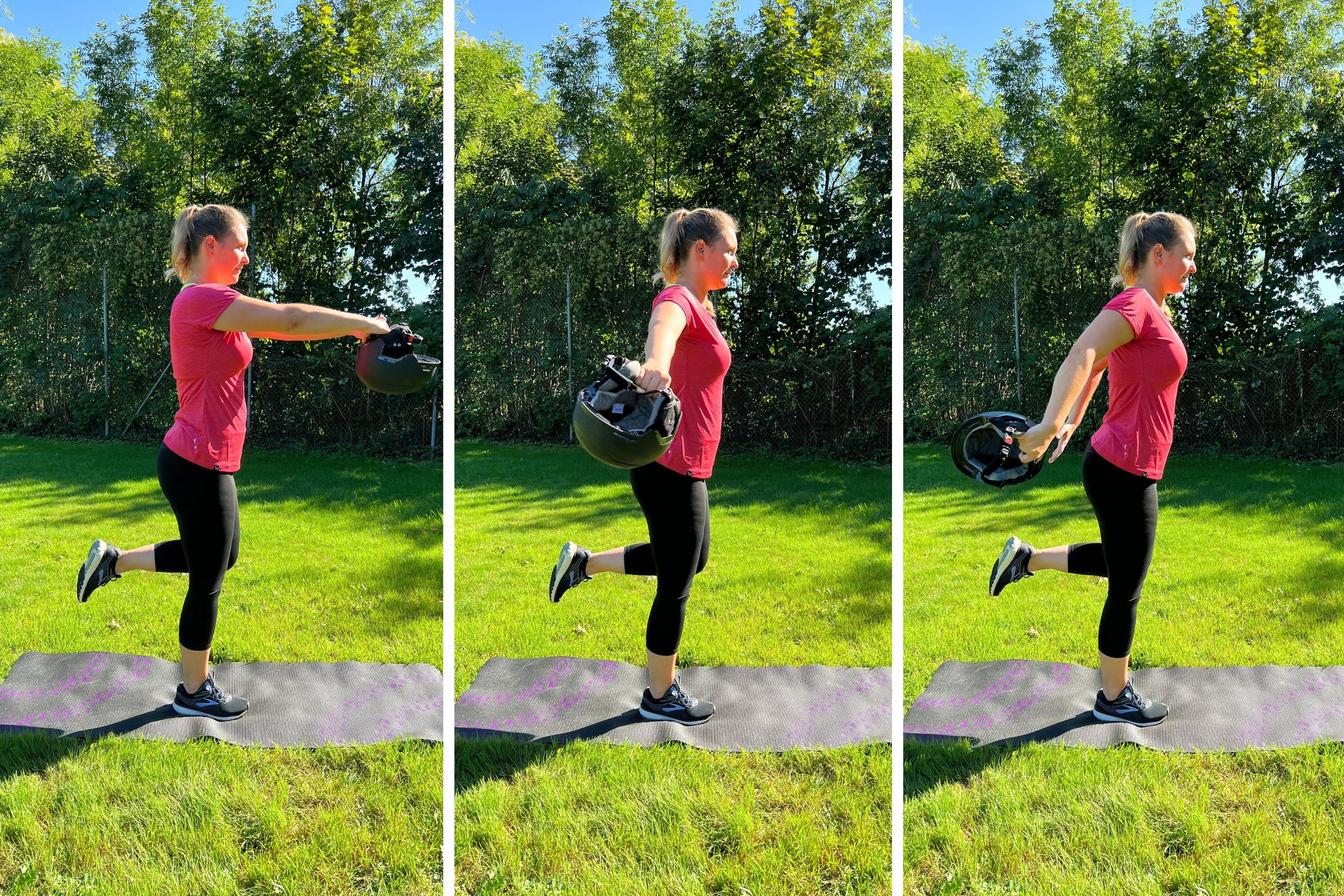 Die Übung wiederholst du dann etwa dreimal. Möchtest du den Schwierigkeitsgrad dieser Übung steigern, dann verlagere abwechselnd dein Gewicht auf das rechte und linke Bein.