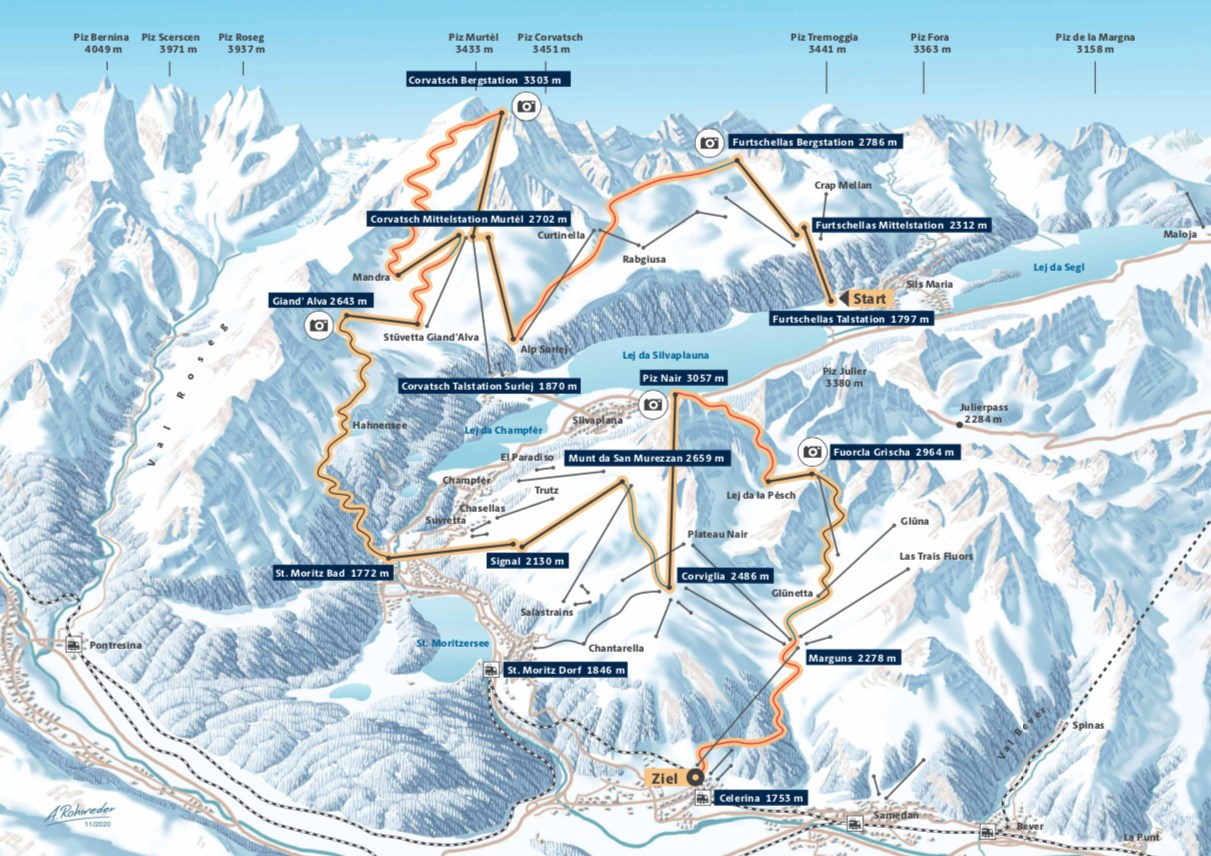 Von St. Moritz Bad geht es nun mit der Signalbahn wieder nach oben ins Skigebiet Corviglia. Hier wurden übrigens bereits fünf Ski-Weltmeisterschaften ausgetragen! Über die breiten Pisten der Snowsafari kommst du jetzt zur Bergstation Corviglia und weiter zum Piz Nair. Bevor du hier oben die nächste Abfahrt startest, lohnt sich ein kleiner Abstecher auf die Aussichtsplattform des Gipfelrestaurants, wo dich ein toller Panoramablick über St. Moritz hinüber zu den Pisten am Corvatsch erwartet. Weiter geht es zum Fuorcla Grischa auf 2.964 Metern. Von dort führt dich eine herrlich lange Abfahrt über Marguns bis ins Tal nach Celerina.