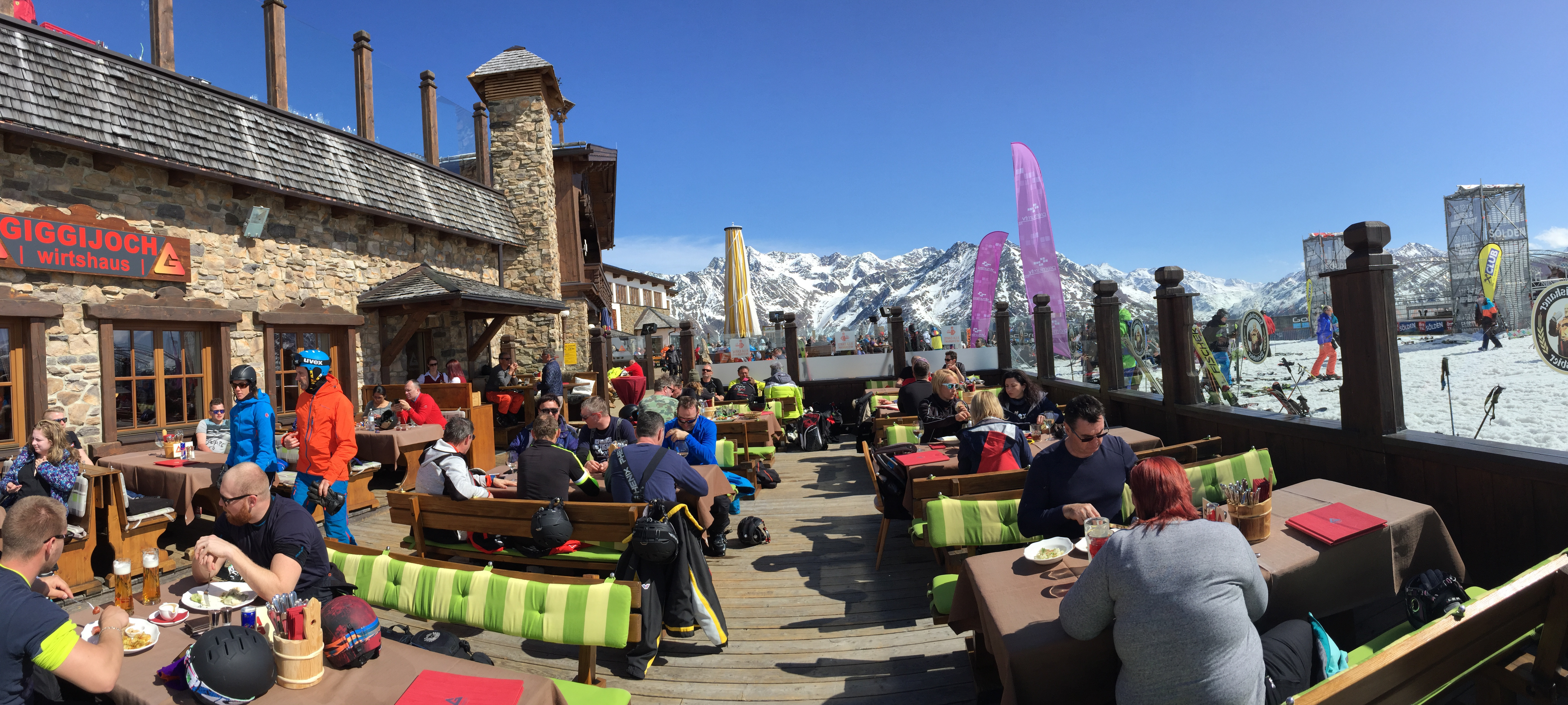 Insgesamt 33 Hütten laden im Skigebiet Sölden zur Einkehr ein. Das Wirtshaus am Giggijoch liegt den ganzen Tag in der Sonne.