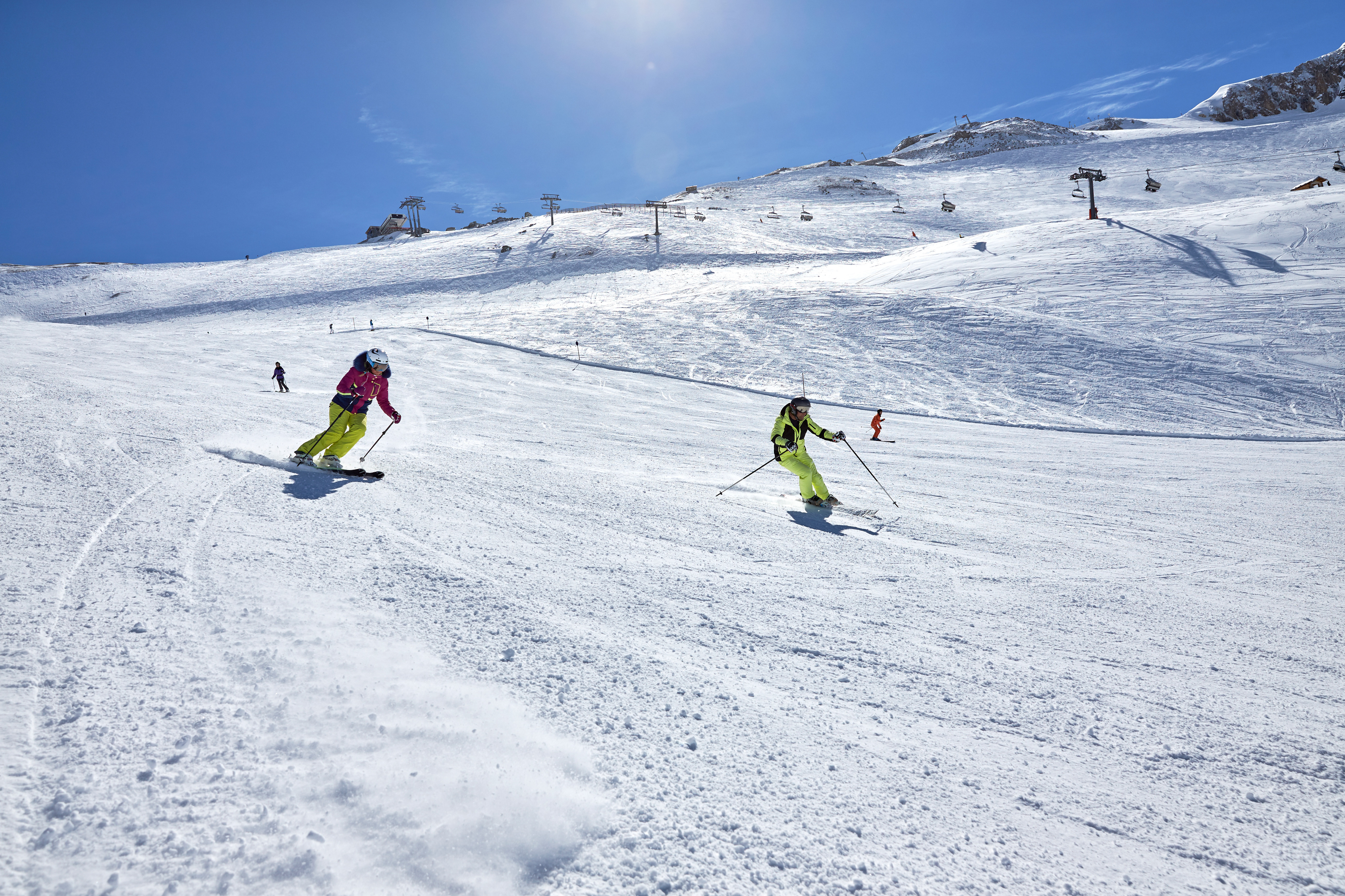 Ischgl ist nicht nur berühmt für die zahlreichen Events, die hier jede Saison stattfinden, sondern auch für seine ausgezeichneten Pistenverhältnisse bis Anfang Mai. Insgesamt 22 Pistenraupenfahrer bringen tagtäglich alle 238 Pistenkilometer in besten Zustand. Die Höhenlage des Skigebiets und die vielen Ost- und Nordhänge sorgen dafür, dass bis zum Ende der Saison eine ausreichende Schneeunterlage und somit hervorragende Bedingungen zum Sonnenskifahren garantiert sind. In Ischgl sind bis zum 1. Mai selbst alle Talabfahrten geöffnet.