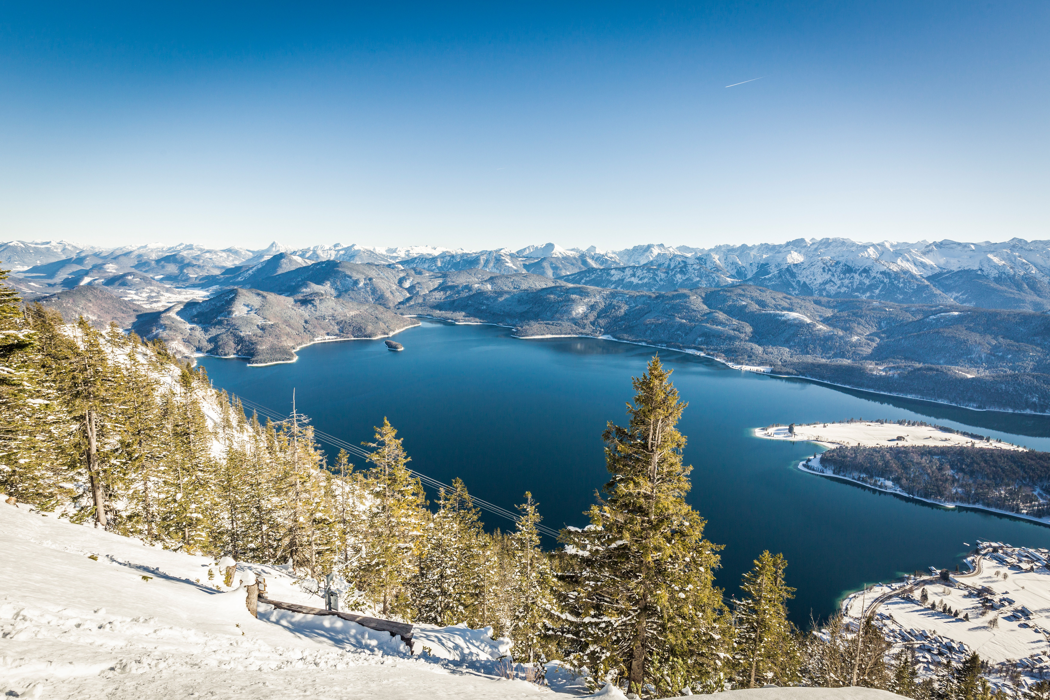Wahrlich herrschaftlich ist der Herzogstand bei Kochel am See. Die 850 Höhenmeter nach oben kannst du entweder zu Fuß erklimmen oder bequem mit der Herzogstandbahn. Das Naturidyll wurde 1857 von König Max II. entdeckt, der daraufhin ein kleines Jagdhaus errichtete. Nur acht Jahre später ließ König Ludwig II. ein Königshaus erbauen und ernannte den Herzogstand zu seinem Lieblingsplatz. Das Königshaus fiel leider einem Brand zum Opfer - geblieben sind dagegen der idyllische Winterwald und bei gutem Wetter die tolle Aussicht bis nach München sowie auf den Kochel- und Walchensee, oder das Karwendel- und Wetterstein-Gebirge.