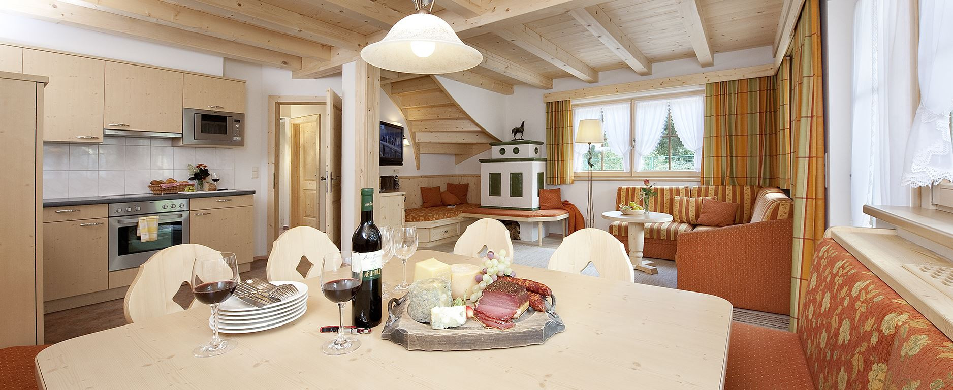 Insgesamt gibt es vier Appartements zur Auswahl, mit Platz für jeweils acht bis zehn Personen. Alle verfügen über eine sehr traditionelle Einrichtung im alpinen Stil, sind gleichzeitig aber mit einer modernen Küche ausgestattet.