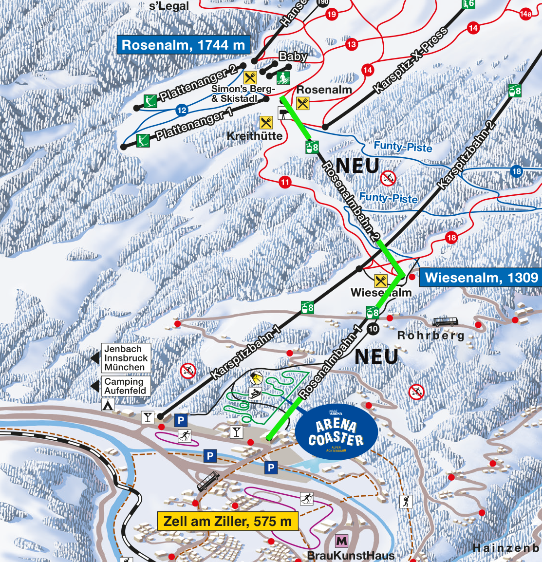 Der Großteil der Abfahrten ist rot gekennzeichnet – perfekte Bedingungen für fortgeschrittene Skifahrer und ambitionierte Genussfahrer. Doch auch Familien und Anfänger kommen nicht zu kurz: Breite blaue Pisten, spezielle Übungsbereiche sowie ein komfortables Liftangebot, darunter die modernisierte Rosenalmbahn in Zell, machen die Arena zu einem echten Allrounder.