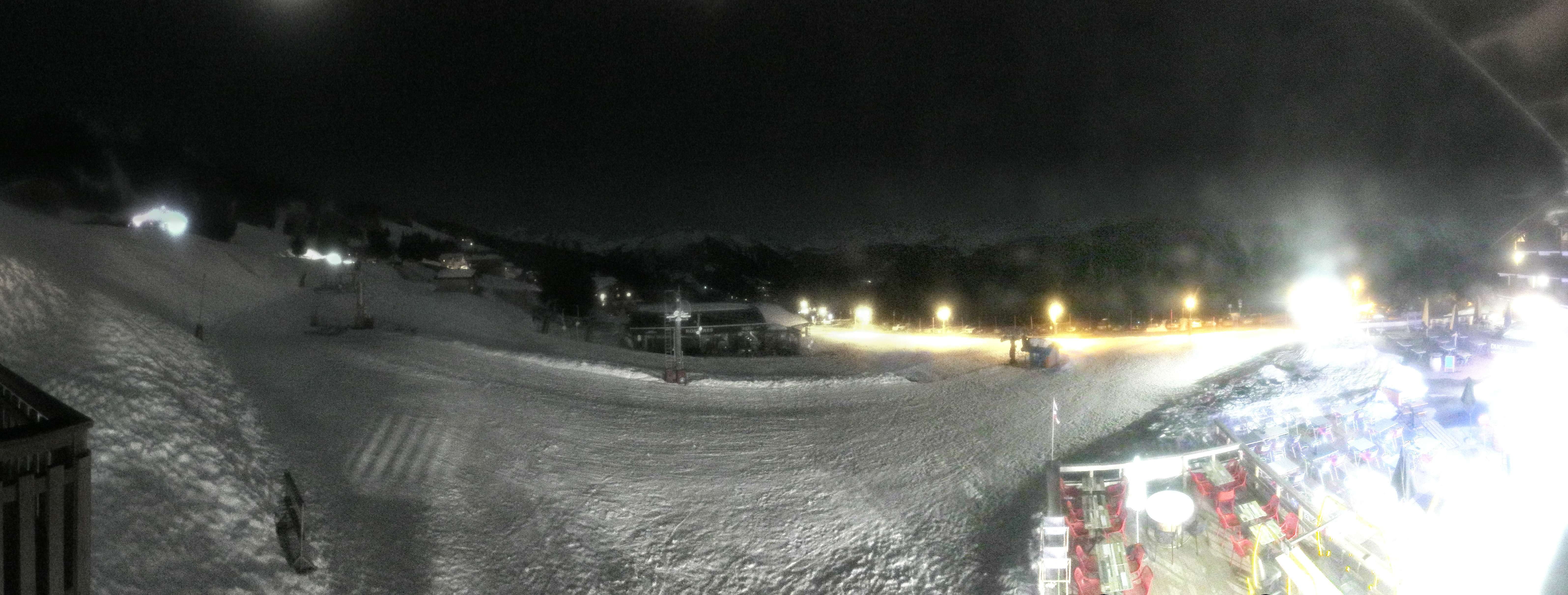 Blick auf die Pisten des Skigebiets Espace Diamant am Bisanne 1500. Im Vordergrund ist die Talstation des Sessellifts Rosières zu sehen, im Hintergrund erkennt man die Berge Mont Blanc (4.810m), Rocher du Vent (2.360m), Aiguille du Grand Fond (2.920m), Pierra Menta (2.714m) und Mont Mirantin (2.460m).