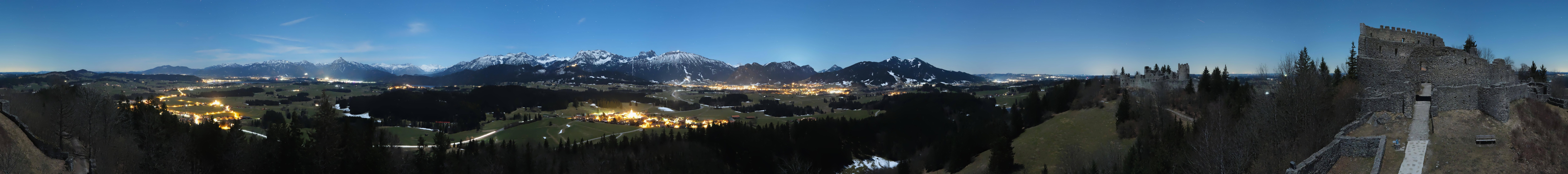 Genieße den Panoramablick von der Burgruine Eisenberg nordöstlich von Pfronten. Bei gutem Wetter kannst du bis zum Schloss Neuschwanstein, zur Zugspitze und zum Weißensee blicken.