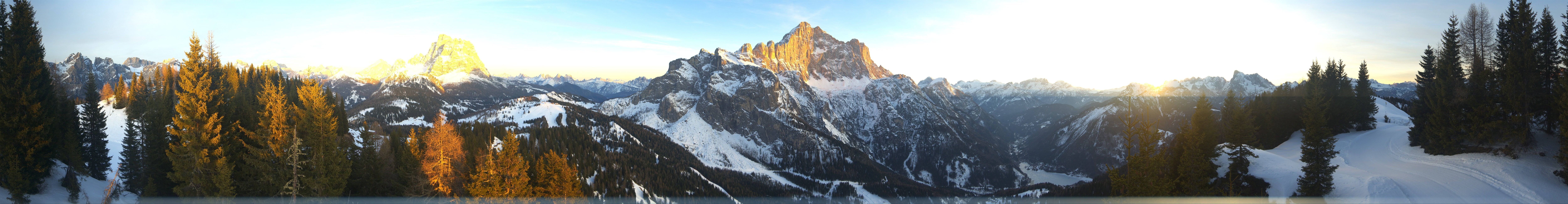 Die Panoramakamera blickt von der Bergstation des Fertazza Sessellifts auf die umliegende Bergwelt Bellunos. Zu sehen sind u.a. die Gipfel des Monte Pelmo (3168 m) und Monte Civetta (3220 m).