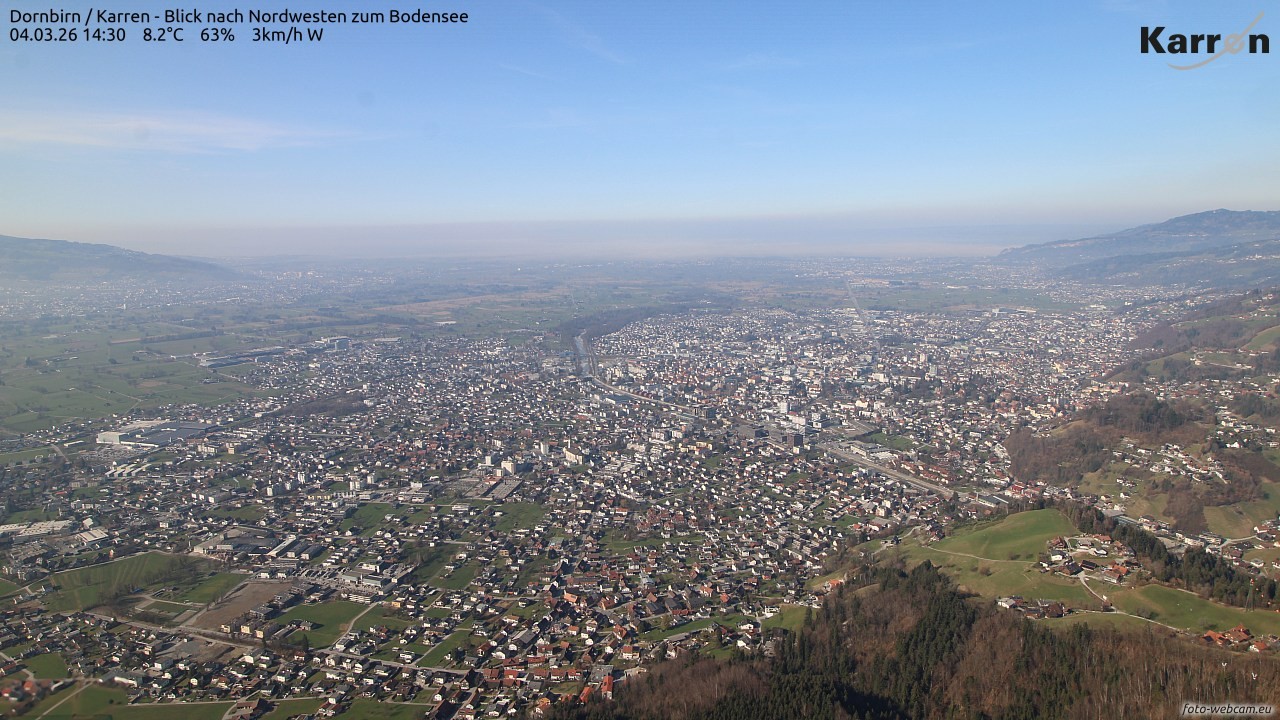 Die Webcam befindet sich in Dornbirn in Vorarlberg an der Bergstation am Karren und zeigt den Blick nach Nordwesten zum Bodensee.
