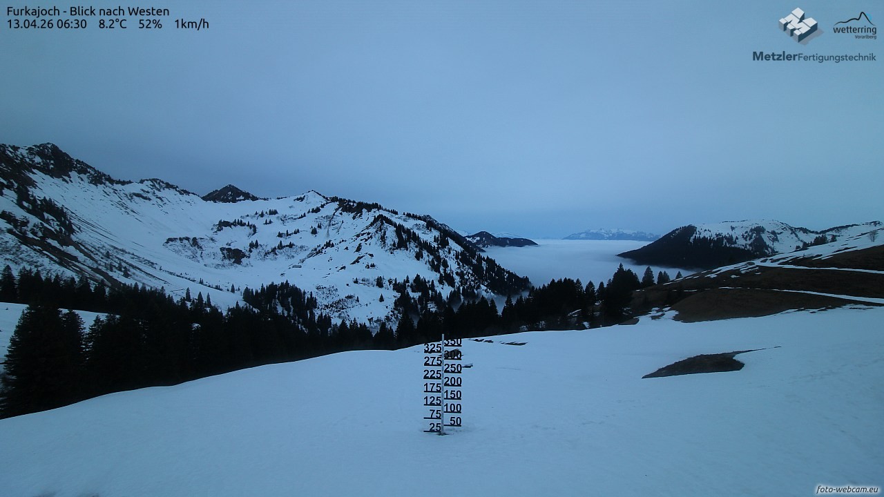 Die Webcam befindet sich am Furkajoch und zeigt den Blick nach Westen Richtung Kreuzspitze, Gerenspitze, Hochgerach, Säntis, Gapfohler Falba und Nob.
