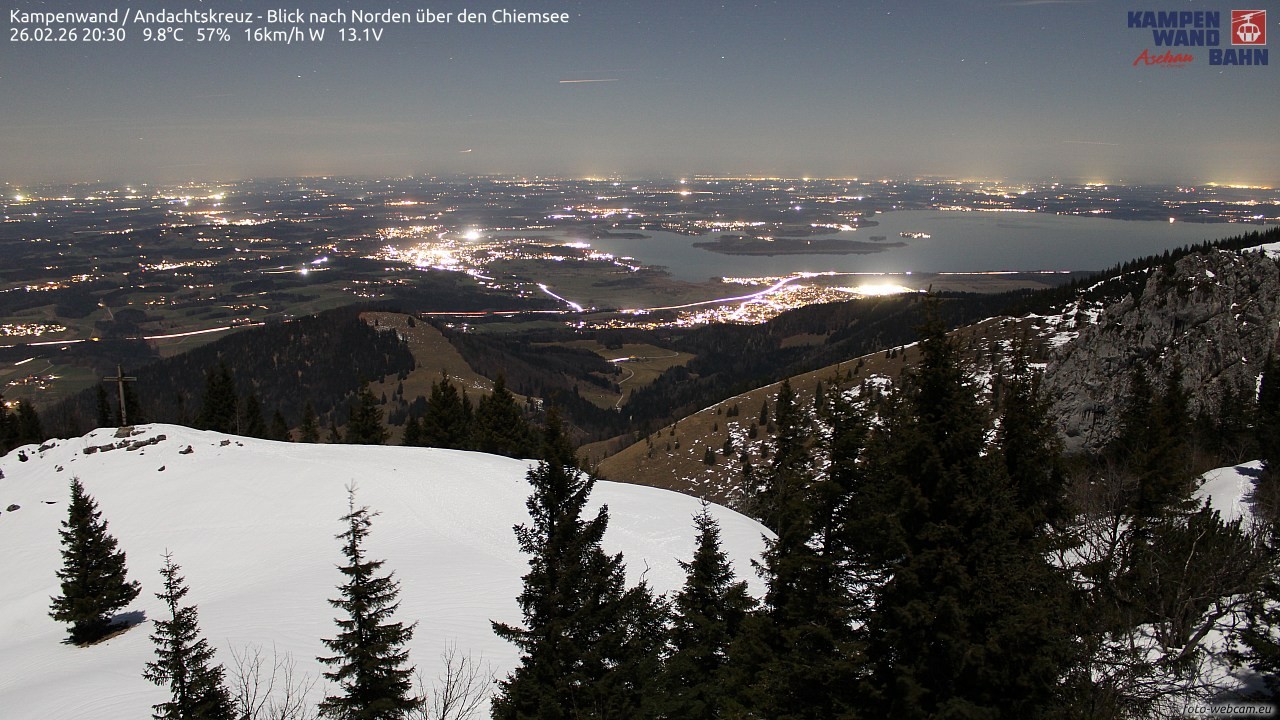 Die Webcam befindet sich am Grat zwischen der Seilbahn-Bergstation und dem Gipfel der Kampenwand. Du blickst Richtung Norden ins Chiemgau. Links im Bild ist das Kampenwand-Andachtskreuz und rechts der Staffelstein zu sehen. Im Hintergrund ist der Chiemsee zu sehen.