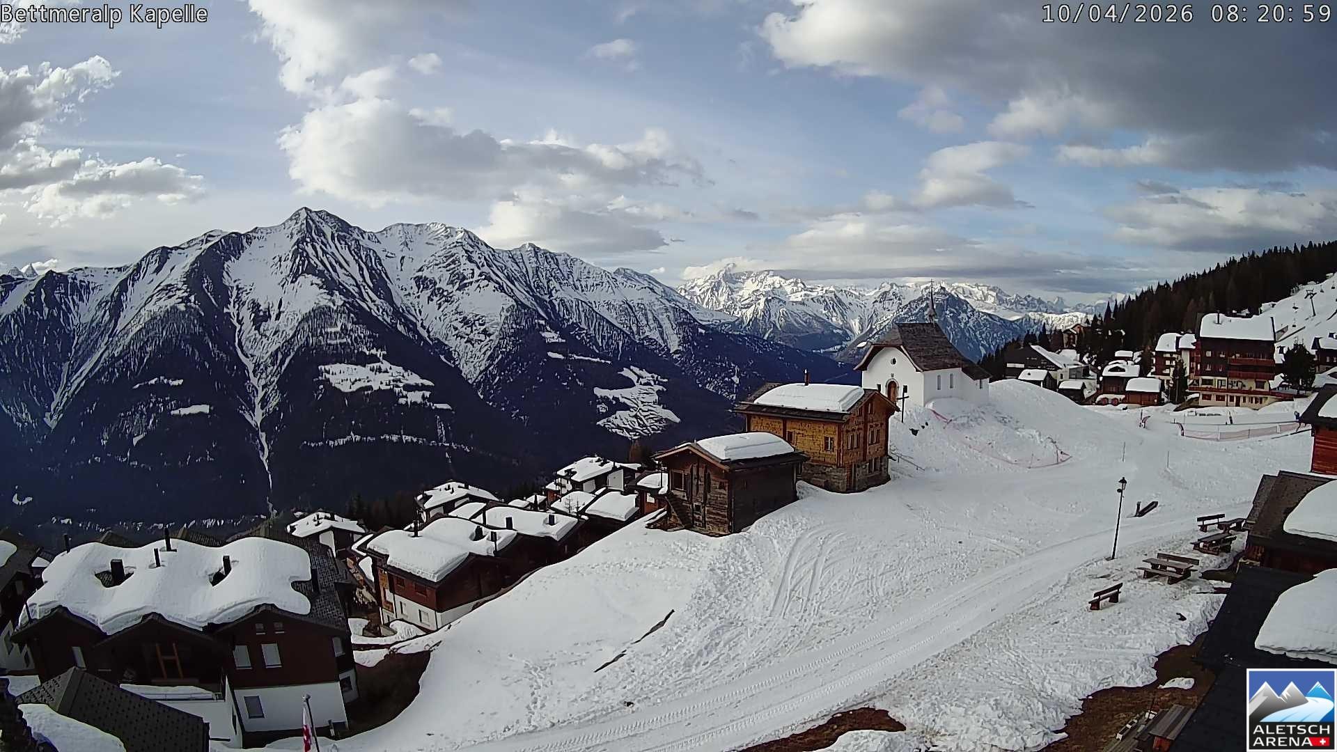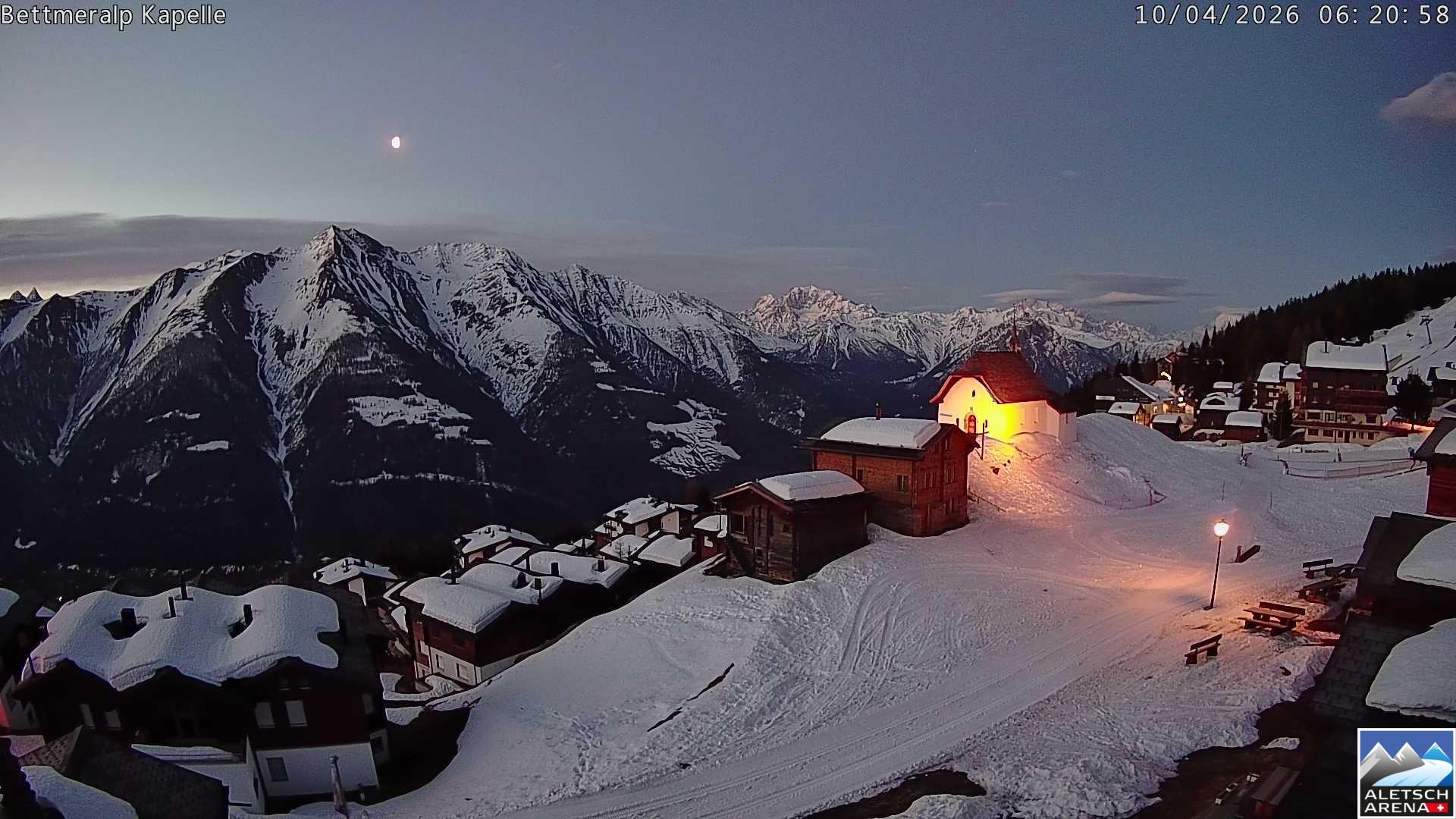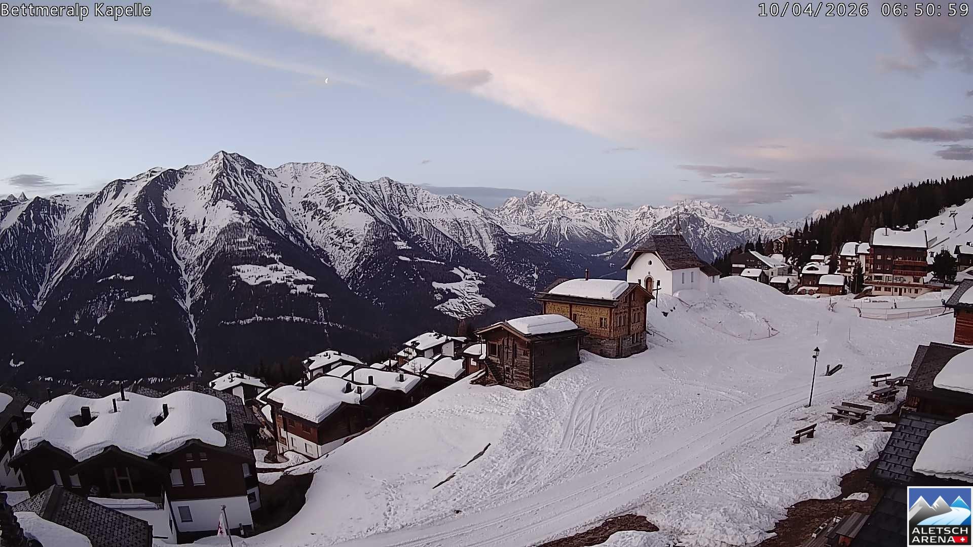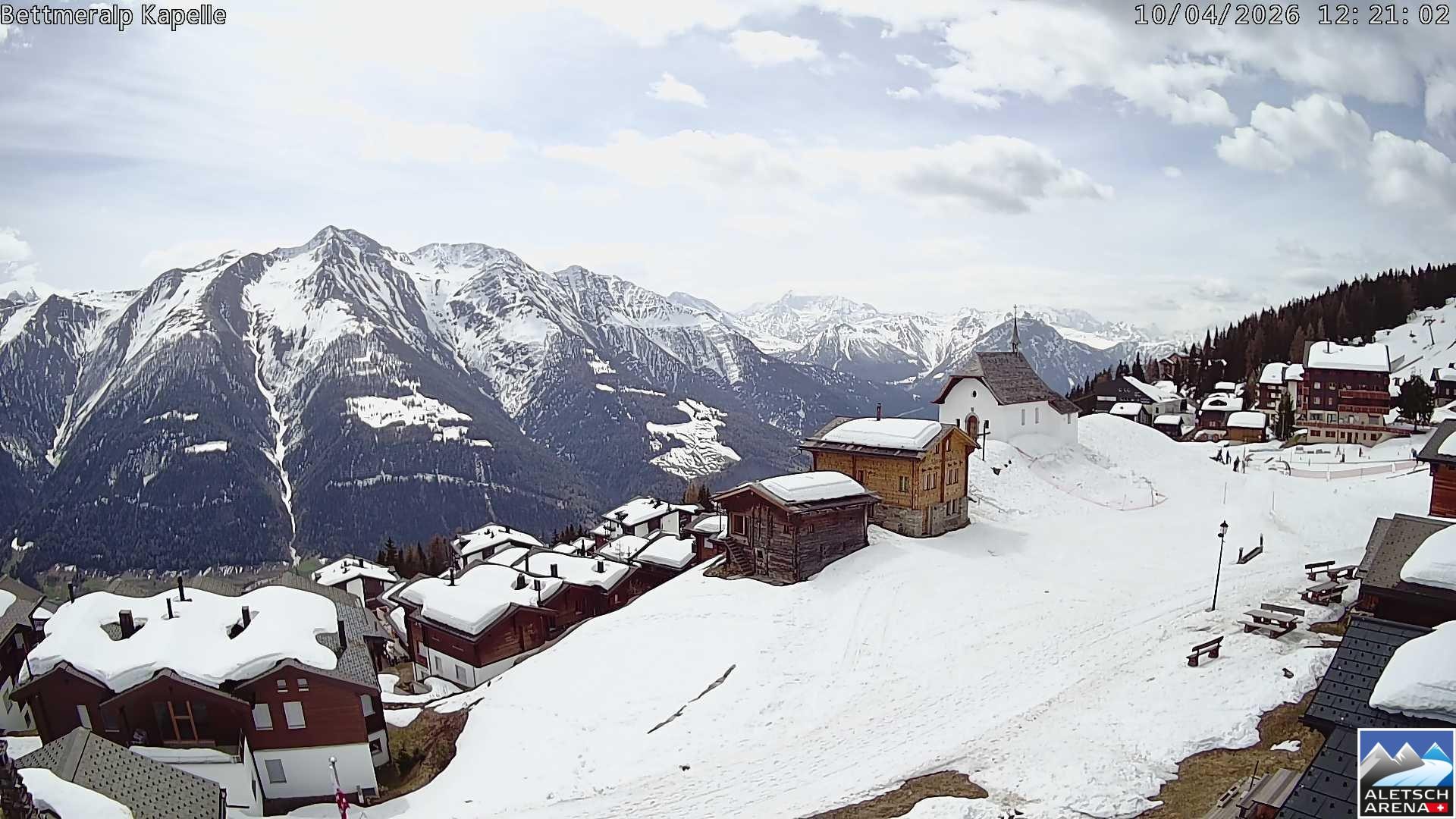 Blick über die Kapelle/Bettmeralp auf die Viertausender des Wallis. Zu sehen ist die Mischabellgruppe mit dem Dom (höchster Gipfel der Schweiz, der komplett auf Schweizer Territorium liegt) und sogar das berühmte Matterhorn.