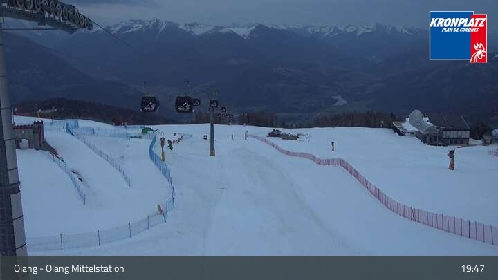 Die Webcam befindet sich an der Mittelstation, wo sich die Gondelbahnen Olang 1° und Olang 2° treffen. Sie blickt auf die Pisten des umliegenden Skigebiets Kronplatz.