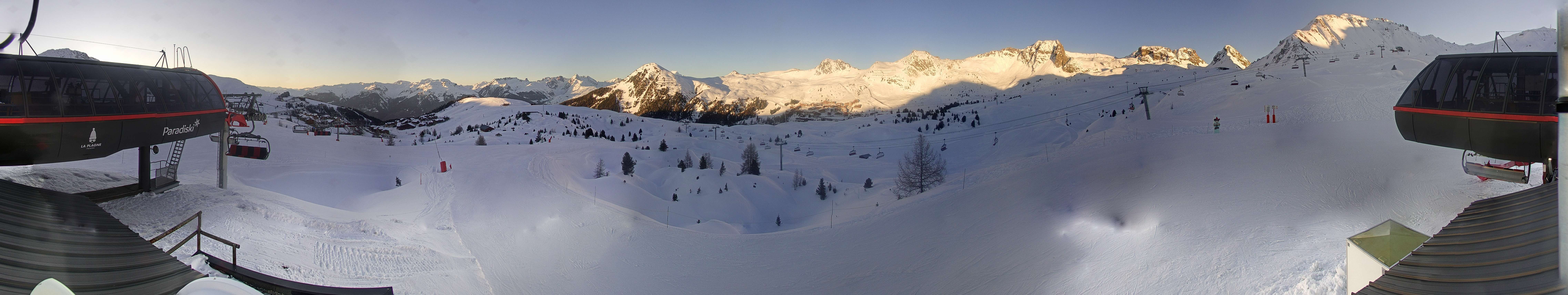 Diese Webcam zeigt einen Rundumblick von der Bergstation La Bergerie im Skigebiet La Plagne.