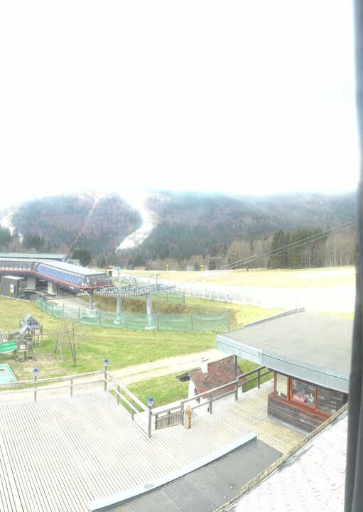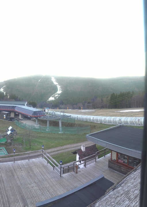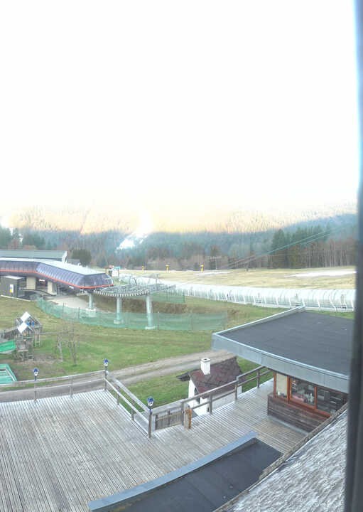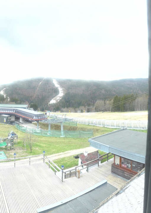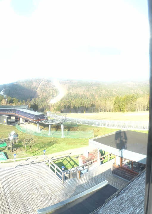 Blick vom Dach des Gasthauses tum Überleben im Skigebiet Hochficht. Gut zu erkennen ist die Terrasse des Restaurants und die Mittelstation der Reischlbergbahn.