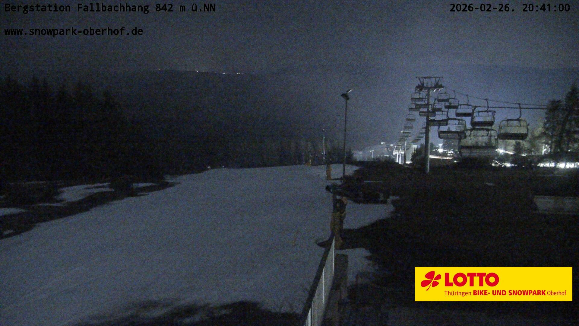 Blick von der Bergstation des Sessellifts am Fallbachhang auf die Skipiste. Das kleine Skigebiet liegt in Oberhof im Thüringer Wald. Im Sommer befindet sich hier ein Bikepark.