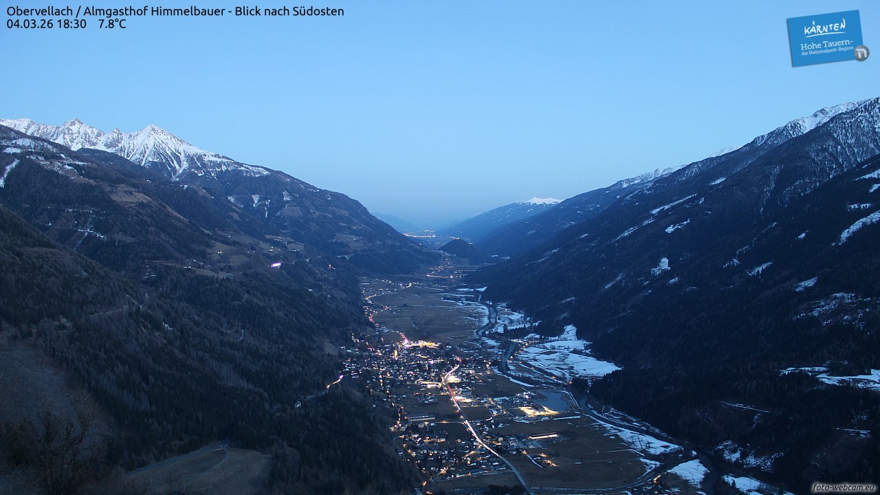 Die Webcam befindet sich beim Almgasthof Himmelbauer in der Gemeinde Obervellach im Mölltal. Der Blick zeigt nach Südosten, im Vordergrund liegt der Ort Obervellach. Im Hintergrund kann man rechts das Goldeck, in der Mitte den Danielsberg und links Teile der Ankogelgruppe erkennen.