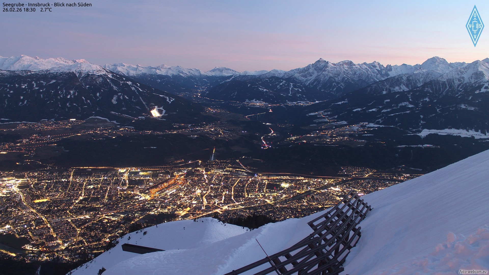 Blick von der Seegrube in der Nordkette in Richtung Süden. Im Tal ist im Vordergrund Innsbruck mit der Skisprungschanze zu sehen, im Hintergrund links der Patscherkofel, in der Mitte das Wipptal und rechts die Stubaier Alpen.